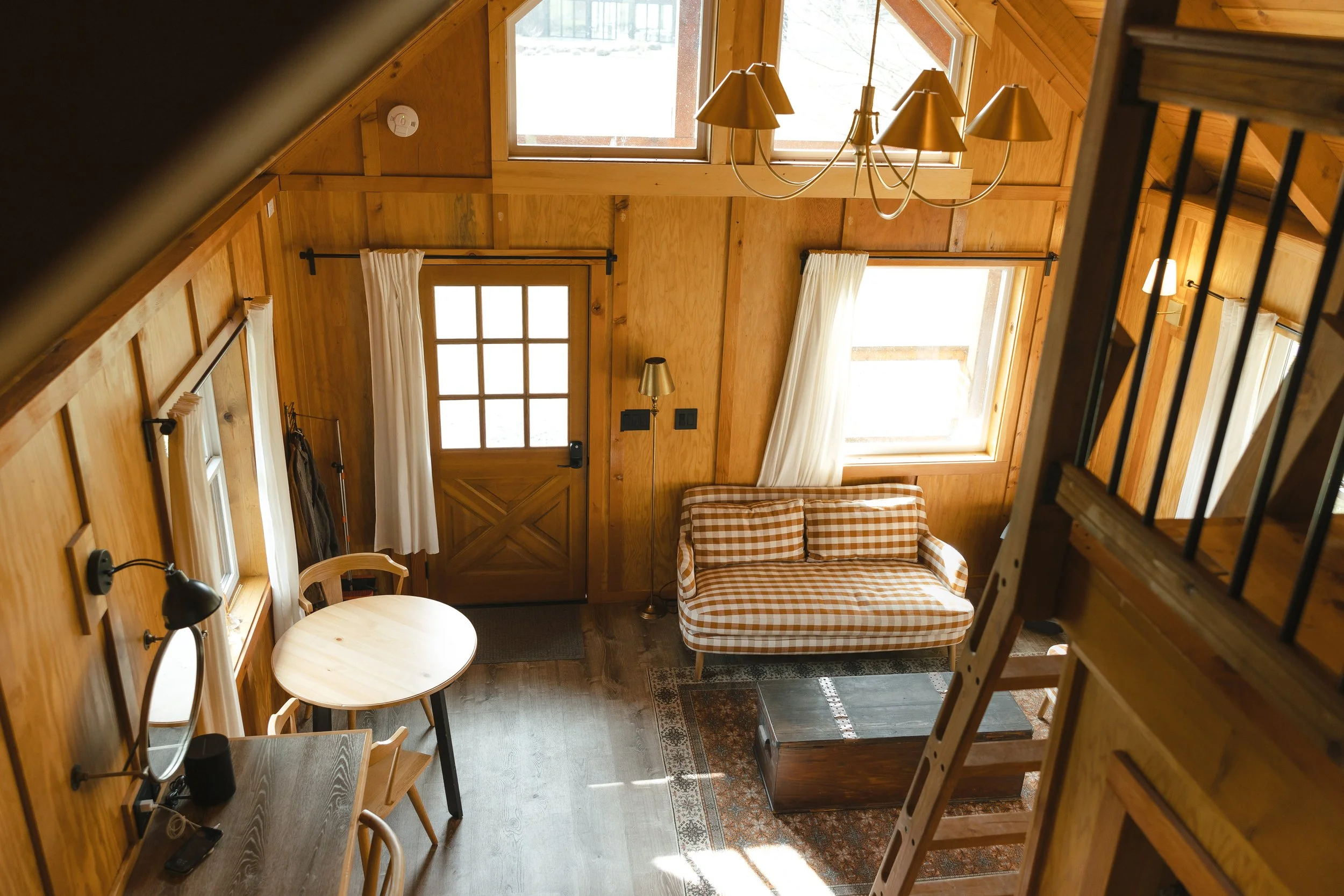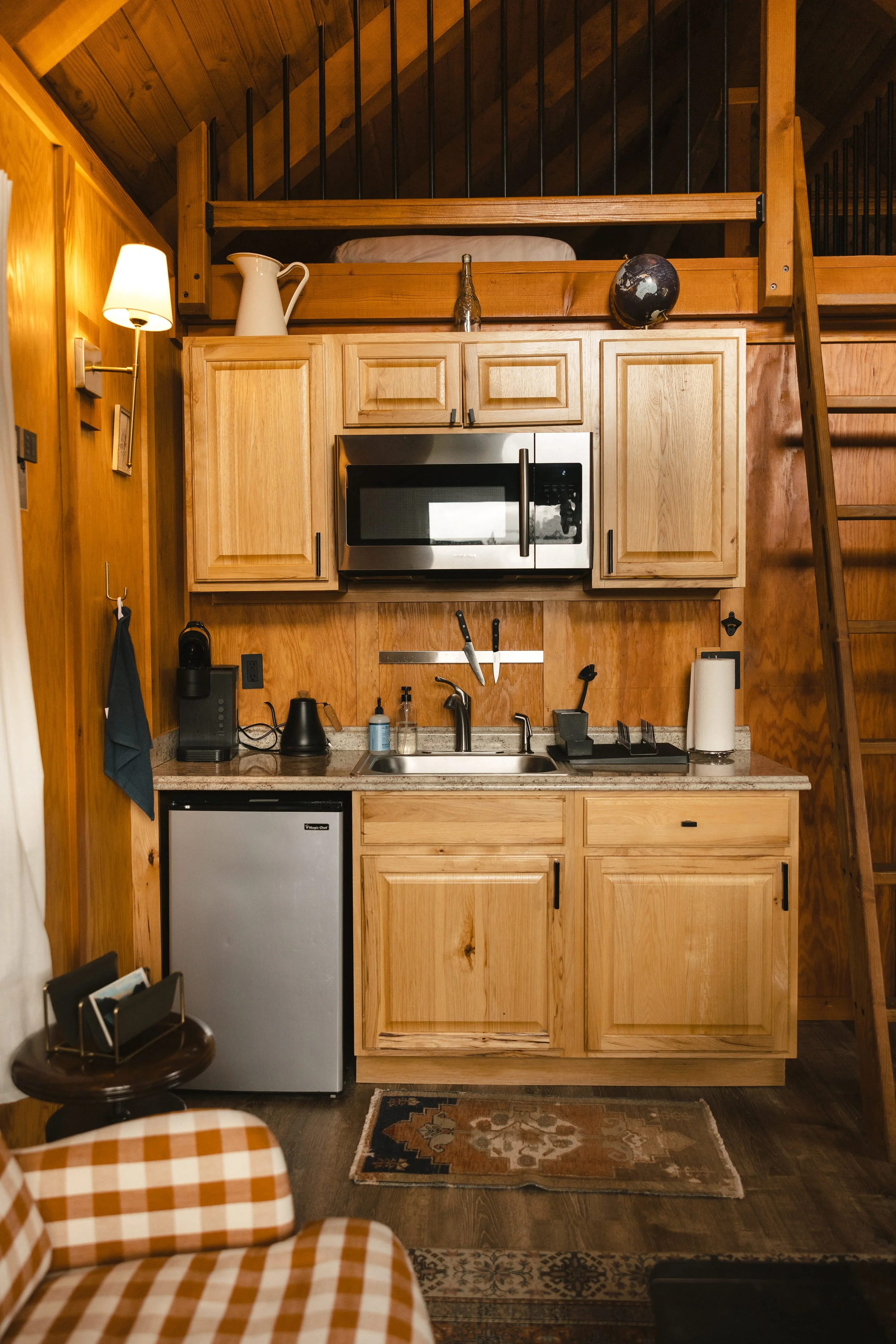 The tiny cabins have mini kitchenettes, microwaves, sinks, dishware. They also have bathrooms with showers, WIFI, a fireplace, coaches, and beds for everyone.